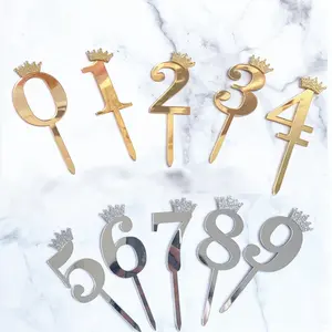 0-9 번호 케이크 토퍼 생일 축하 귀여운 크라운 번호 케이크 깃발 아크릴 컵케익 토퍼 생일 파티 케이크 장식 토퍼