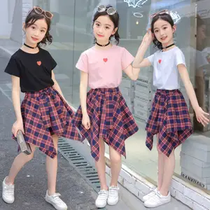 여름 사춘기 아이 옷 세트 소녀 하트 패턴 Tshirt + 격자 무늬 치마 정장 소녀를위한 어린이 복장 10 대 의류 4 8 12 14