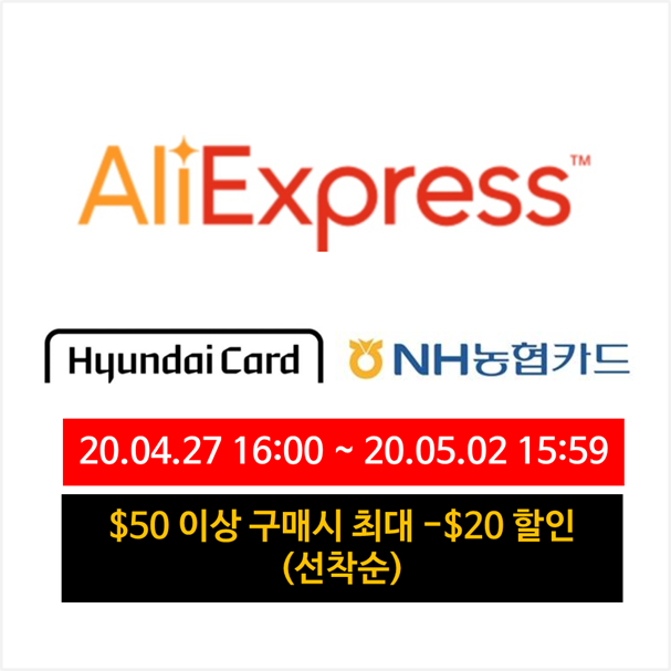| [알리테크] 카드할인행사 4월27일 READY! 20달러 줍줍 40% 즉시할인 GOGO! 농협비자|현대마스터 카드 환영 (0) | 2020.04.26 |