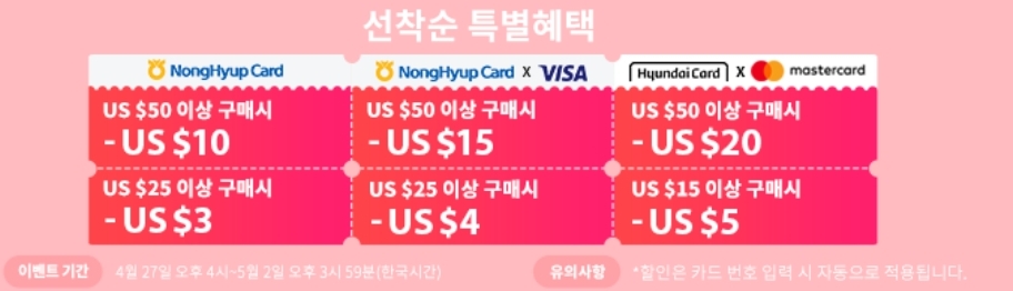 셀렉트쿠폰과 스토어쿠폰 뿐 아니라 NH농협카드(비자)와 현대(마스터)카드에서 공동으로 프로모션을 진행합니다.
